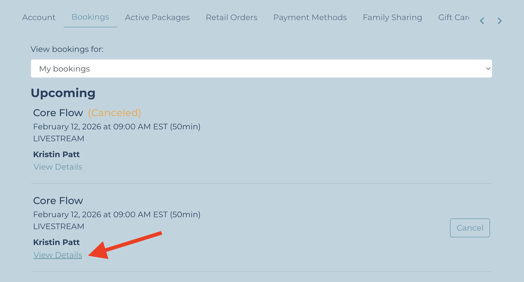 Click on bookings to view all classes you are currently enrolled in.